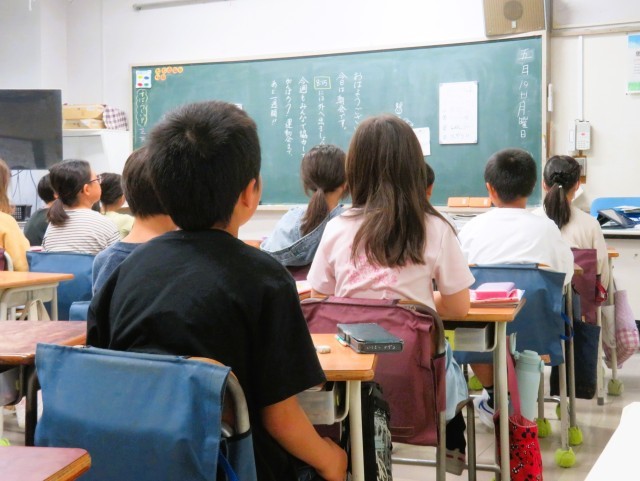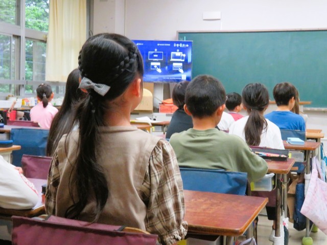 写真は、話を聞いている4年生の様子です。
