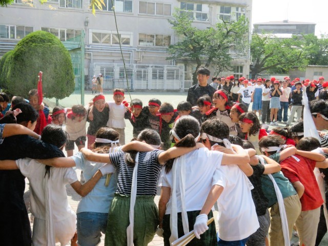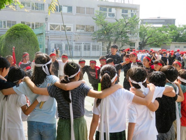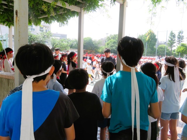 応援団の子どもたちは、ミストシャワーを浴びながら、振り返りを行い円陣を組みました。運動会当日が楽しみです!