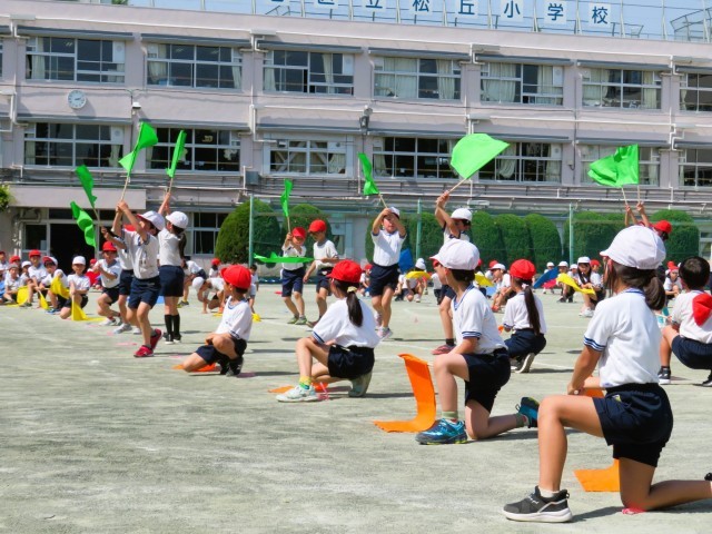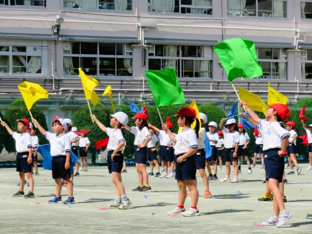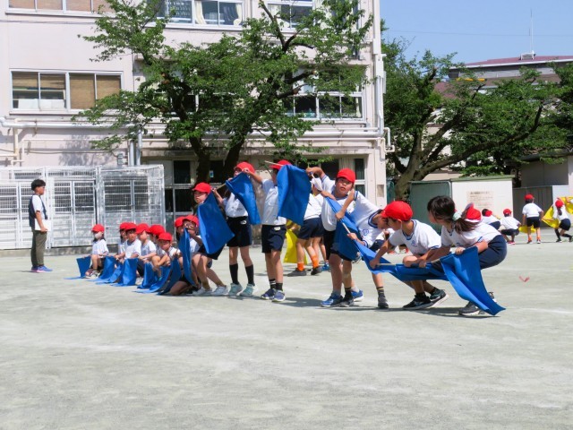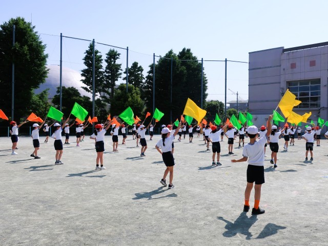 3年生の表現は「STAR LIGHTフラッグ70」です。色とりどりのフラッグを使って全身を使って踊ります。1組赤、2組青、3組黄色、4組緑、5組オレンジのフラッグを使って表現します。