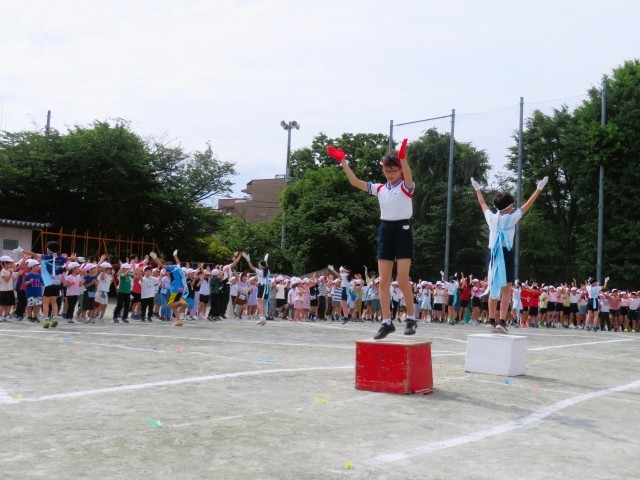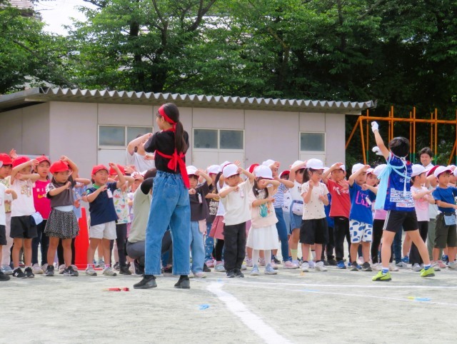 応援団のお手本ダンスを見ながら、軽快な音楽にからだを揺らしながら上手に踊っています!