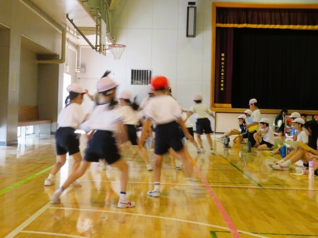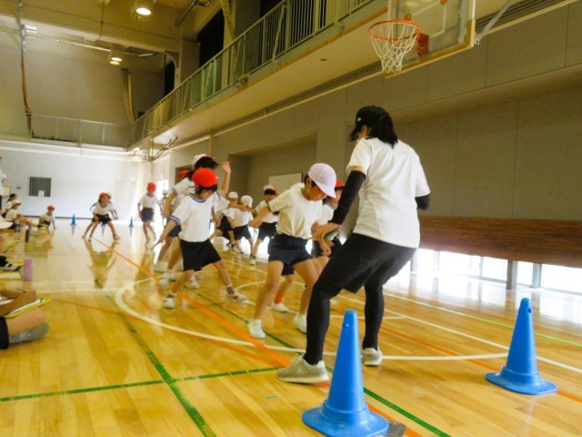 写真は、1年生「反復横跳び」の様子です。