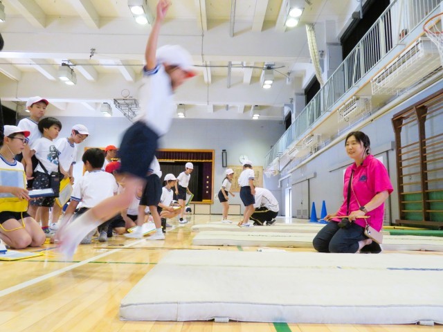 写真は、1年生「立ち幅跳び」の様子です。