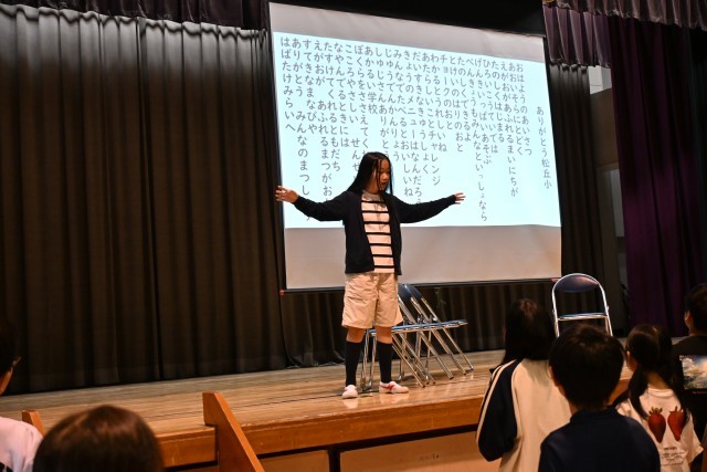 続いて「ありがとう松丘小学校」を歌いました。この曲は、創立60周年記念として、当時の子どもたちが作詞、音楽の先生が作曲した曲です。