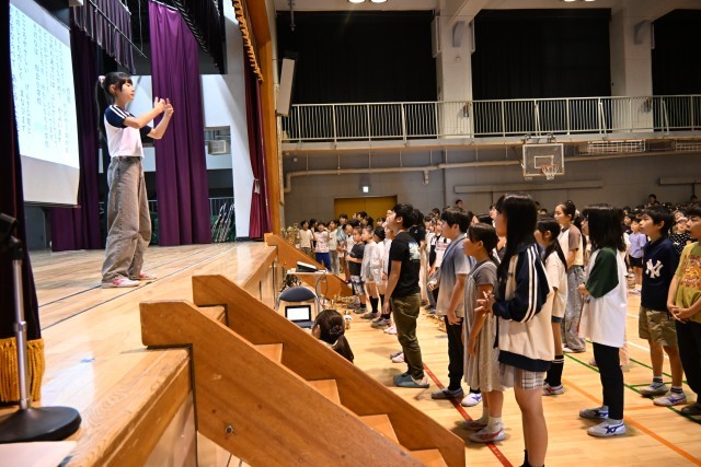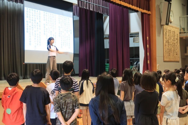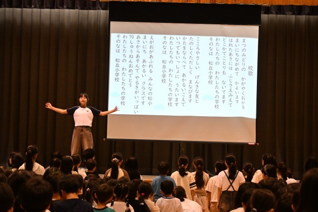 最後に、校歌を歌いました。通常の1番、2番に加えて、3番は、子どもたちからのアイデアを合わせて、企画代表委員が作詞した「開校70周年記念歌詞」を歌いました。現在の松小を表した、私も大好きな歌詞です。3番に入ると、ひときわ大きな声が体育館に響き渡りました!