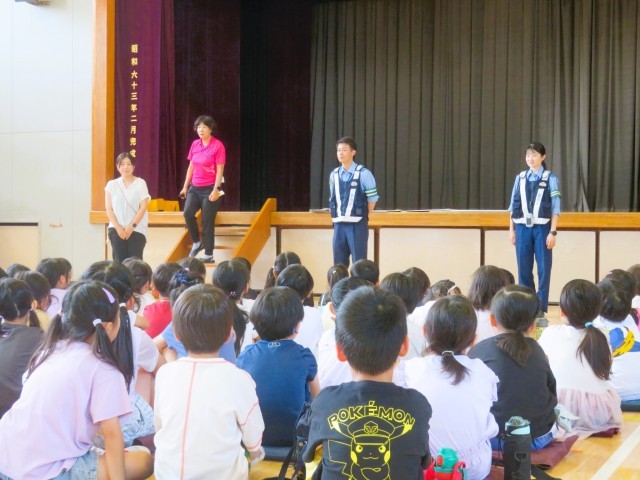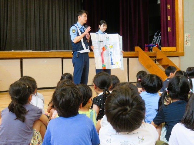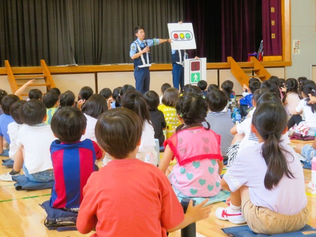 今日は1年生が、世田谷警察署の方々をお招きして、交通安全教室を行いました。横断歩道の歩き方や、駐車している車の横を通るときのポイントを学びました。