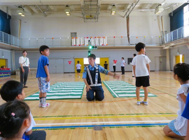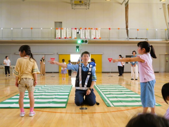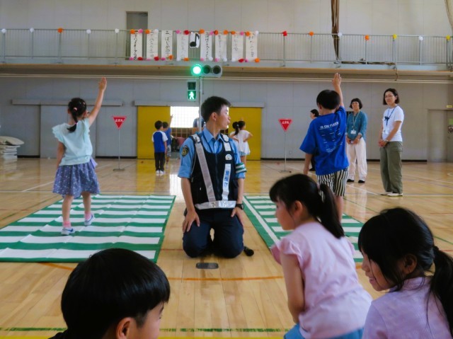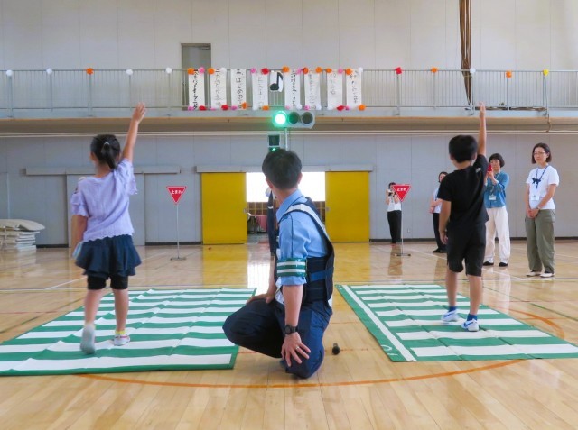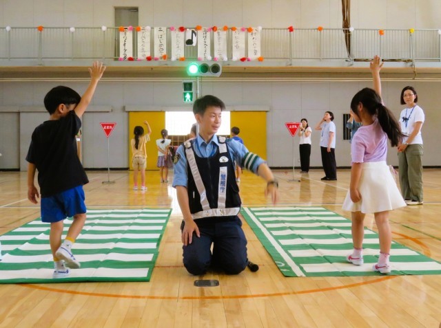 正しい横断歩道の歩き方のお手本を見せていただきました。青信号でも、右・左・右をしっかり確認します。そして、横断歩道を渡る時には、しっかり手をあげて目立つようにして渡ることが大切です。