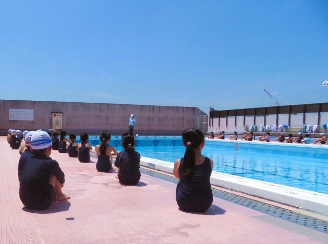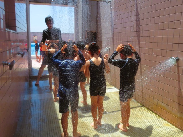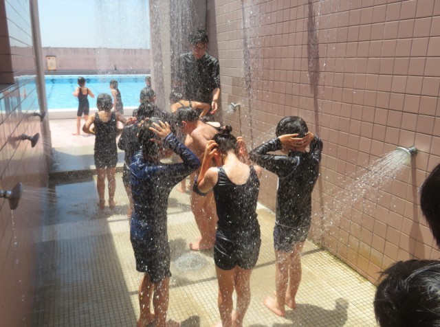1年生初めての水泳学習の様子です。大きなプールでの並び方、シャワーの浴び方、タオルの置き方など、一つ一つの学習を学びました。地獄のシャワーも体験です!
