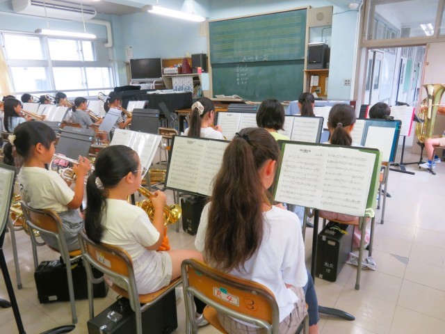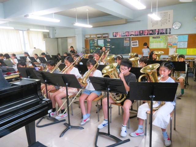 金管バンドの皆さんは、緑陰子ども会に向けて、毎朝の練習をがんばっています。音楽室に入ると、いつも気持ちのいいあいさつがあり清々しい気持ちになります。『緑陰子ども会』は7月12日開催で、次の3曲を演奏します。