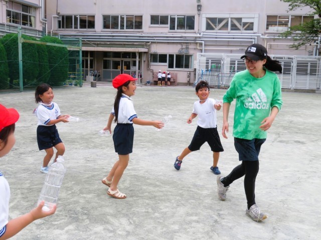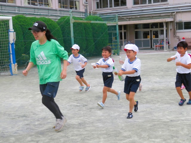 絶好のお天気で、ご家庭で用意していただいたペットボトルなどの容器を使って水遊びを楽しみました。担任の先生は、びしょ濡れです!