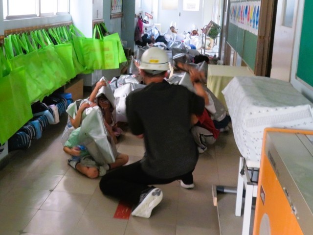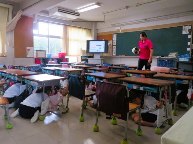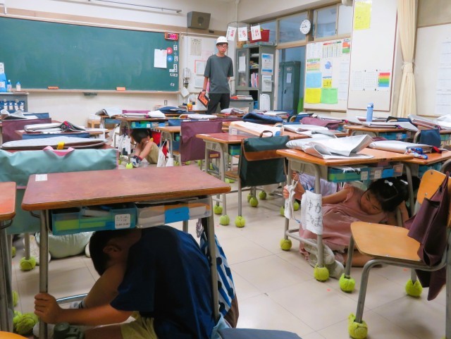 7月の避難訓練は、授業中に事務室から火災が発生という想定で行いました。子どもたちは、「お・か・し・も・ち」の約束を守り、素早く、そして真剣に避難訓練に取り組みました。余震への対応も行いました。