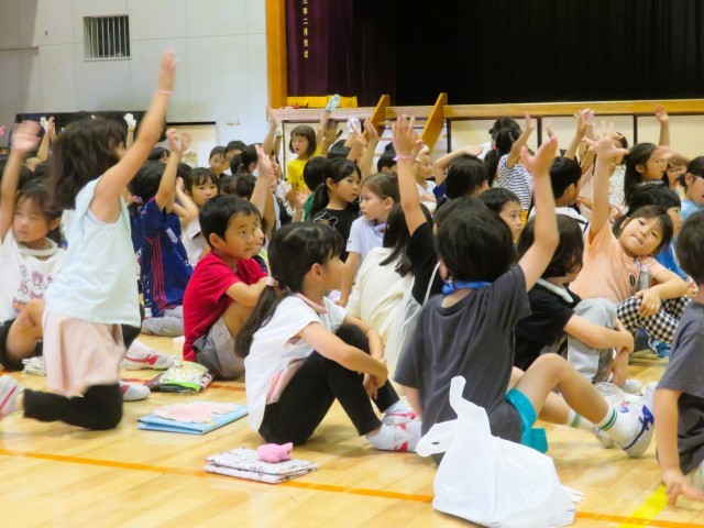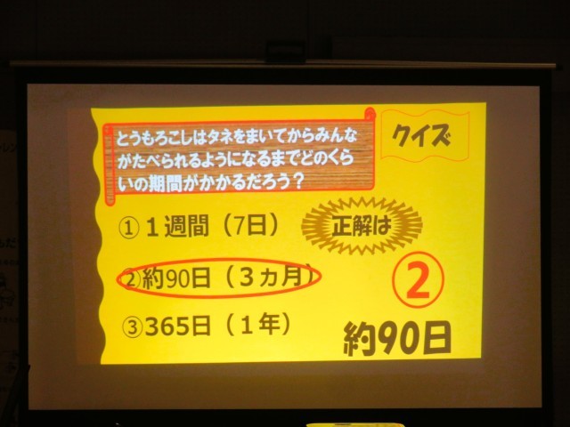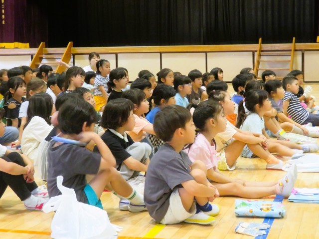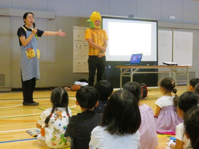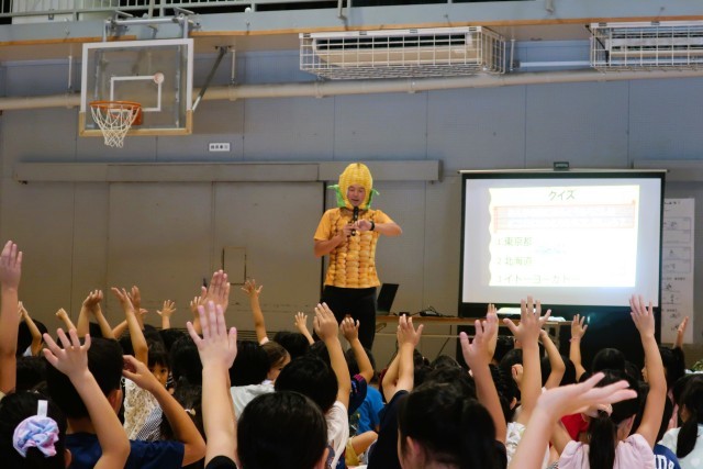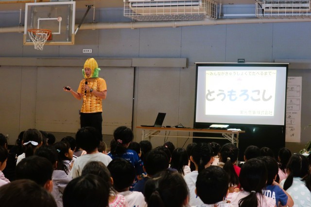 今日は1年生が、生活科の学習で「トウモロコシの皮むき」体験をしました。今日の給食にでる朝採れトウモロコシです。まず、「トウモロコシ博士」から、どこでとれたものか、種から収穫までどの位かかるかなど、クイズ形式で説明がありました。