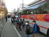 4学級が3台のバスに分乗意して出発です。先生方のお見送りに、手を振って応えるみ...