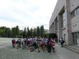 最高の遠足日和です。校庭に集まった3年生が空を見上げて、晴れ晴れとした表情を見...