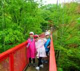 班ごとにオリエンテーリングです。吊り橋を渡っています。 霧雨は、子どもたちのパワ...