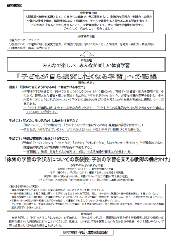 単元を通して「なにができるようになるか」を明確化し、「どのように学ぶか」課題解決学習を促す学習環境の設定や教師の直接的な働きかけが継続的に行うことができれば、児童は主体的に学習を調整しながら自分自身や他者、モノと関わり合い、学習の成果として達成感を得ることができる。という研究仮説のもと、授業をつくっています。