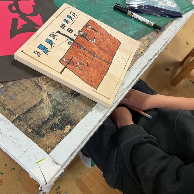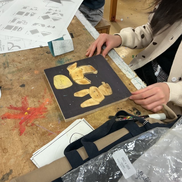 図工の時間に彫刻刀に挑戦しました。好きなものをテーマに版画を作ります。