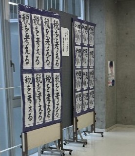 松沢小学校で、「税に関する書道」に挑戦した人たちの作品を掲示しています。入賞者は全校朝会で表彰されました。