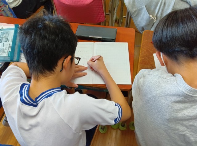 6年生は算数で対象な図形について学習しています。今回は点対称の対応する点や辺について学習しました。私語がなく集中して取り組む姿に感心しました。