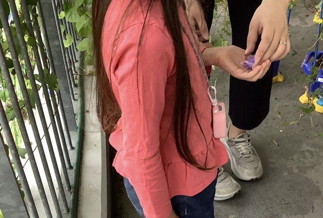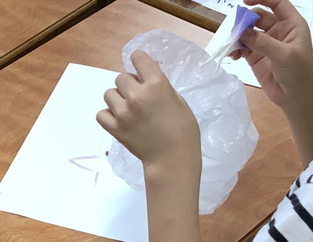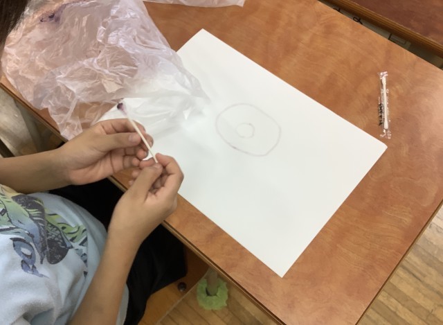 1年生は、育てた朝顔のお花を使って、絵を描きました。絞ったお花に綿棒をつけて、綺麗な色を楽しみました。今日は、学校公開日です。みんないつもより張り切っているようです。