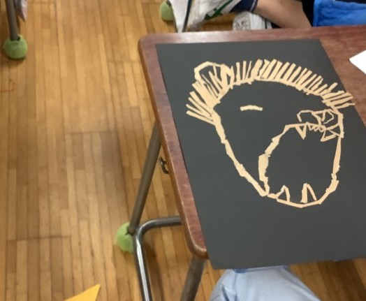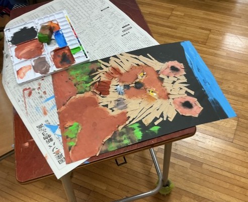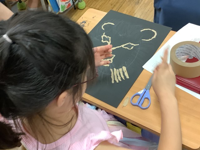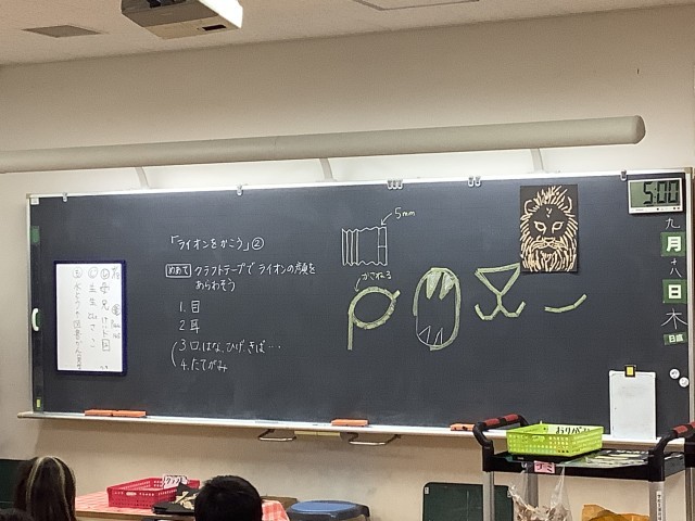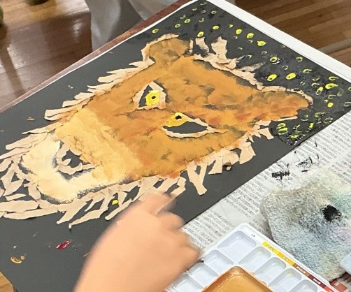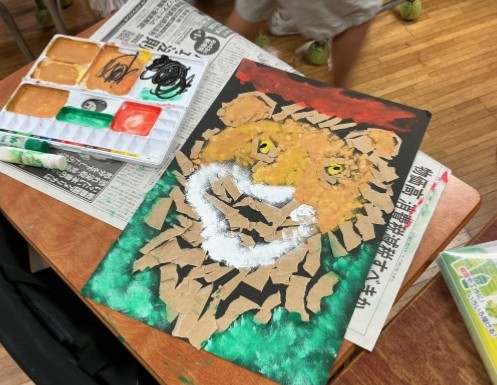 2年生は、クラフトテープを使って、ライオンを描いています。手でちぎったクラフトテープの輪郭やたて髪が独特の雰囲気を醸し出します。
