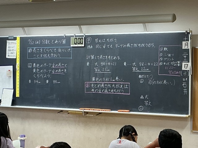 3年生は、分数とわり算について学習しています。分数で表された大きさは、わり算を使って求められることについて、自分で追究していき、友達と一緒に確かめます。
