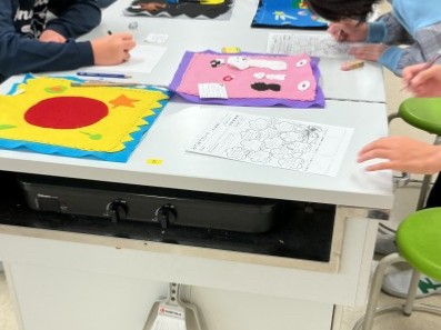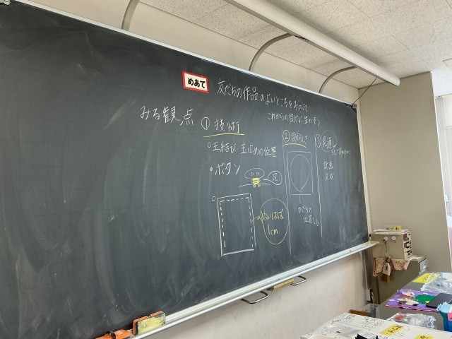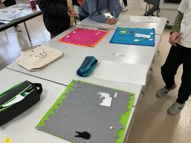 5年生のクッションカバーが完成しました。お互い工夫したところを見つけて伝え合います。