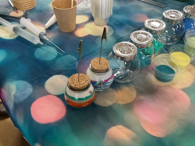 初めの説明で、カラフルな砂を使って絵を描けることを知ってみんなびっくり。