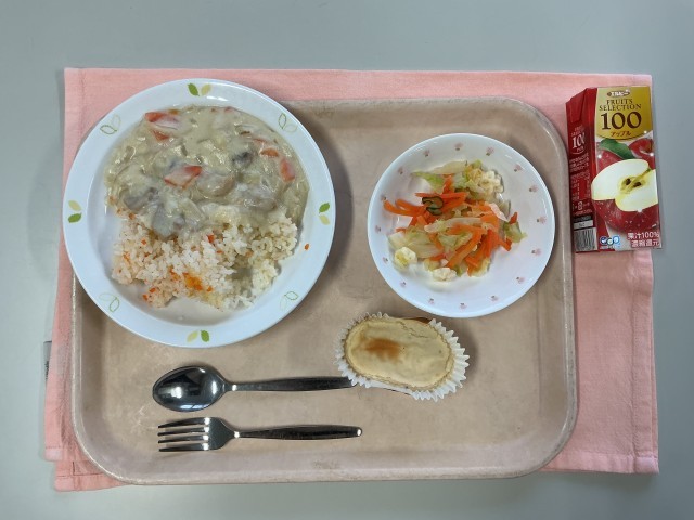 12/24 今日の給食 公開日 2025/12/24 更新日 2025/12/24 できごと 今日は2学期の給食最終日。華やかなクリスマス献立です。サンタの白ひげをイメージした「クリームライス」、星型の米粉マカロニを油で揚げてトッピングした「クリスマスサラダ」、いちごを使った「米粉チーズケーキ」、そしてりんごジュースです。 いいね(0)