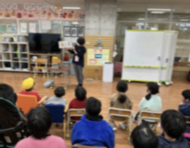 読み聞かせで、4冊の絵本を読んでいただきました。4冊目の、ちょっと不思議な展開にみんなシーンとなって引き込まれていました。最後に理由がわかると、納得と安心の表情に変わりました。