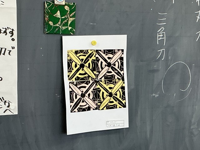 6年生は、模様の版画に挑戦しています。同じ木版画を4つ刷り、向きを工夫して合わせると、複雑な模様になります。それぞれ個性的な模様になりました。