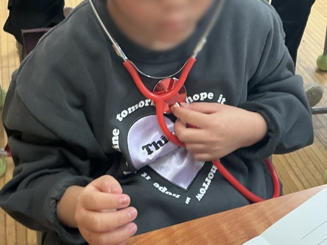 聴診器で自分の心臓の音を聞くと「どくんどくんって音がする。」「かわいい音がする。」「心臓を聞いて楽しかった。」とたくさんの感想が出ました。