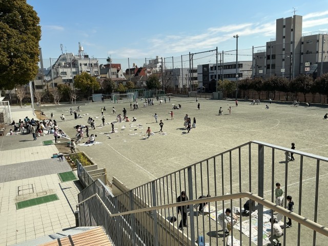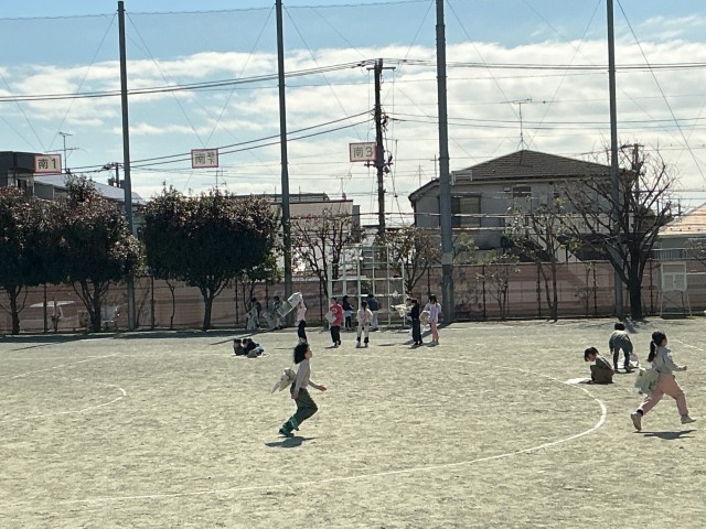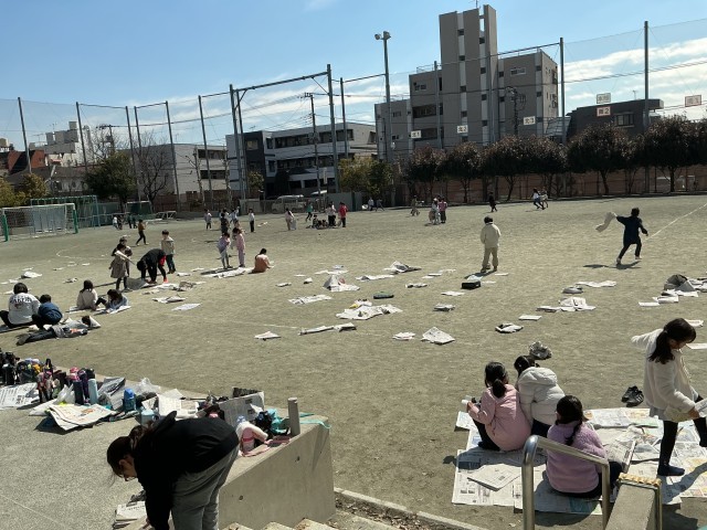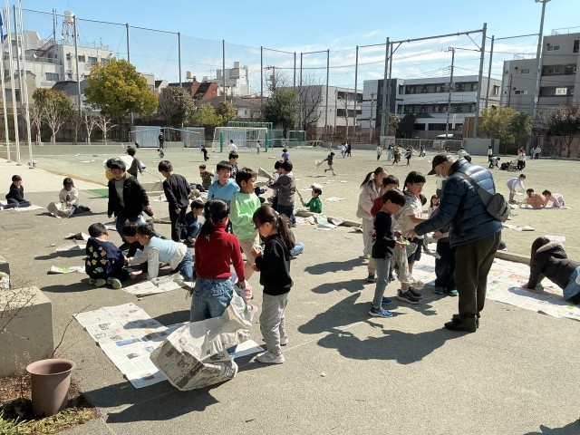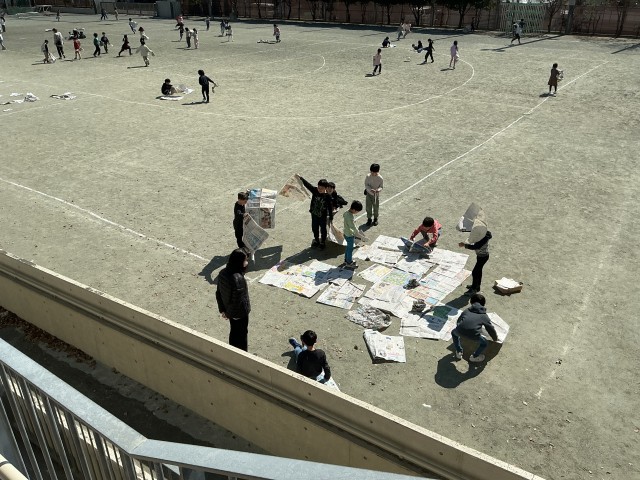 1年生最後の図工は新聞紙で遊びました。校庭で新聞紙の特性を活かして楽しく遊べました!