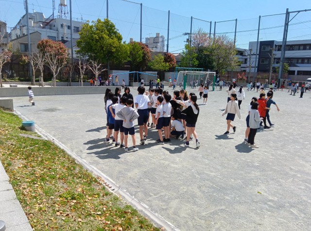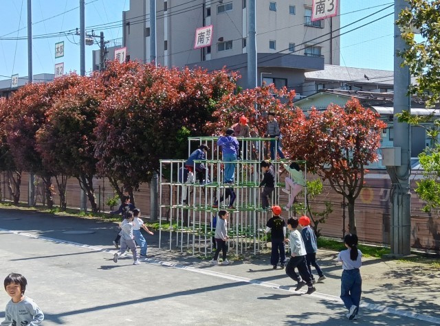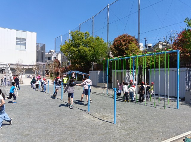 休み時間には、たくさんの子が校庭に出て遊んでいます。少し風が冷たいのですが、陽の光があたたかです。ボール投げやジャングルジム、一輪車、うんていなどたのしそです。外に出てたくさん身体を動かしましょう。