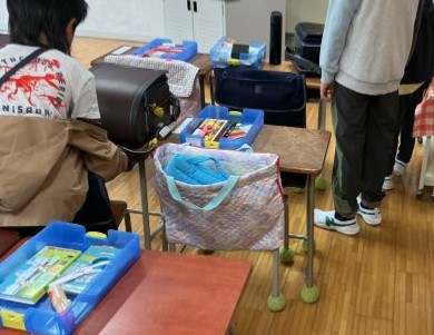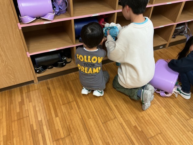 1年生が慣れるまでの期間に、6年生が1年生の朝の支度をお手伝いしています。6年生が1年生に優しく教える姿が、とても頼もしいです。