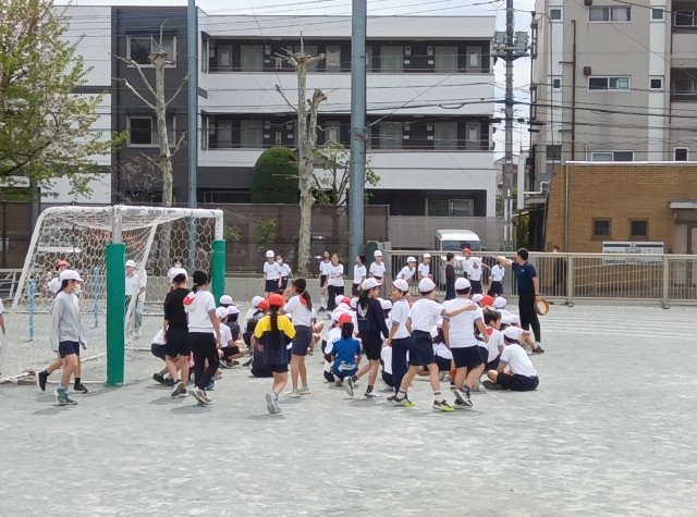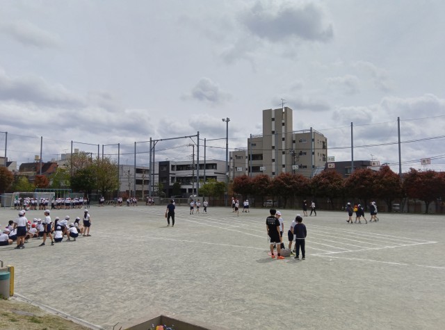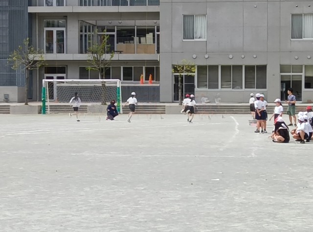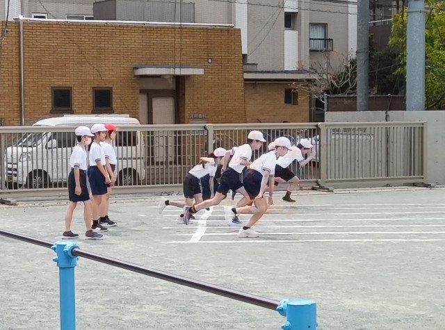 6年生が50m走を行っていました。準備運動の後、軽く身体を慣らしてから、記録を計りました。6年生が走ると迫力があります。