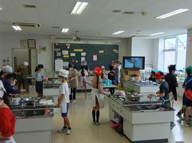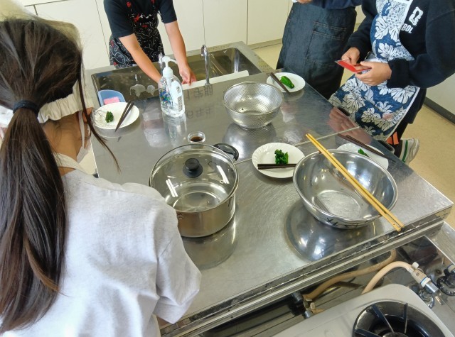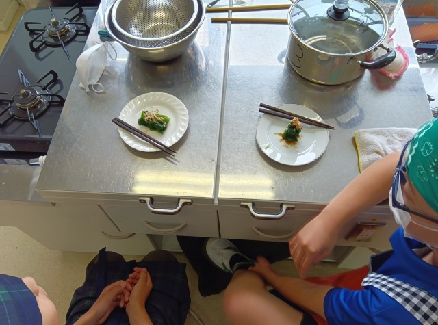 5年生が家庭科で調理実習に取り組んでいます。ほうれん草をゆでて、おひたしを作っていました。5年生になってはじまった家庭科7に、もう調理実習をしているなんて、すごいなと感じました。すべての班が事故なくできあがったようです。方法をしっかり理解して、事故やケガなく作ることは大切ですね。鰹節をかけておいしそうにできあがりました。
