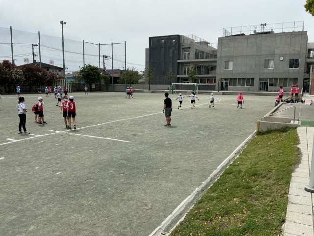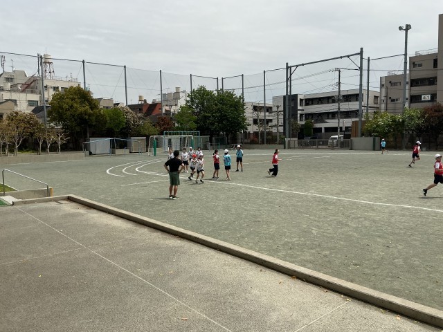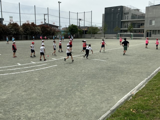 6年生が体育でリレーに取り組んでいます。グループでバトンパスを速くできるように練習しています。後ろを振り向かず、前の走者がどの辺りまできたらスタートすればいいか、友達とアドバイスをし合っていました。