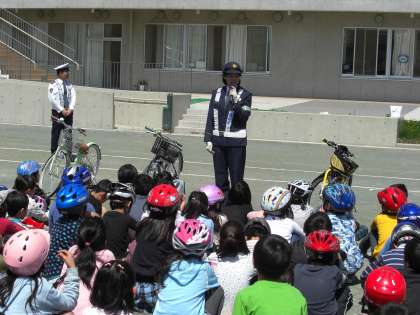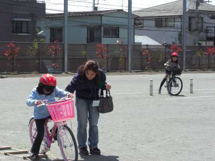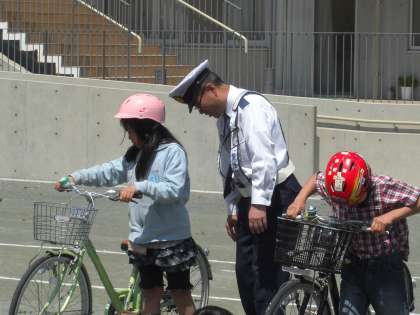 ヘルメットをかぶり、実際に自転車に乗って行います。