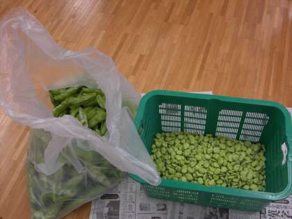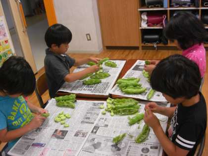 各教室で旬の食べ物である空豆の皮むきをしました。