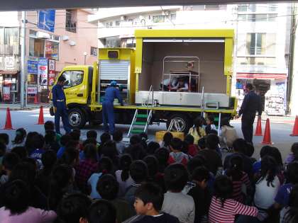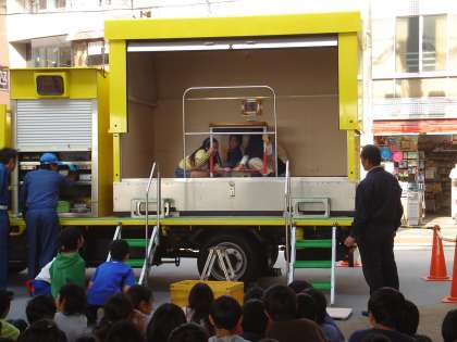 その後、4年生は起震車体験をし、他の学年は地震災害についてのビデオを見ました。