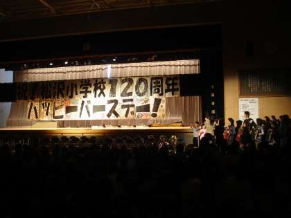 徐々に幕が上がり、ステージ後方には各学級で分担して作成した「祝!松沢小学校120周年ハッピーバースデー!」の文字が現れました。
