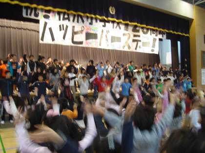 ギャラリーに5年生、ステージに6年生、フロアに1〜4年生と分かれて、元気よく松沢サンバを踊りました。
