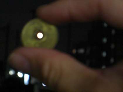 このスーパームーンを五円玉の穴から覘くと、ほとんど同じ大きさになります。