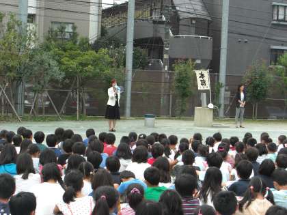 今回は家庭科室からの出火を想定して、校庭に避難しました。
