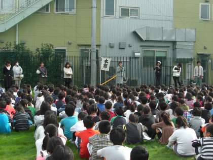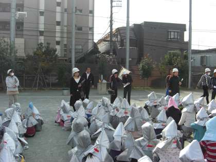揺れがおさまった後は、防災頭巾をかぶり校庭へ避難しました。