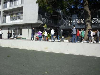 次に運動委員会が、大縄のいろいろな跳び方を紹介しました。