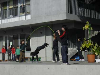 ダブルダッチでの二重跳び、跳びながら側転、逆立ち、バク転などの演技のたびに児童から歓声が上がっていました。