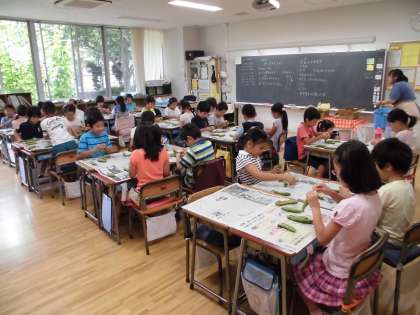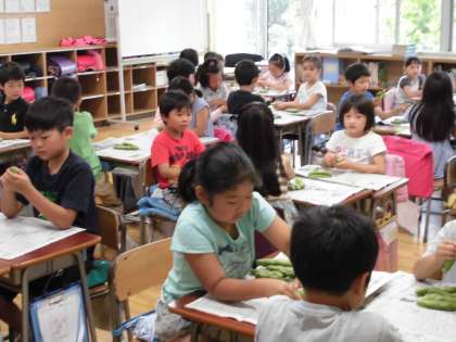 6月16日(火)2年生が生活科の学習の「やさいをそだてよう」の一環として、旬の野菜であるソラマメの皮をむきました。約120人の2年生が意欲的に皮をむいたソラマメは、今日の給食のおかずになりました。