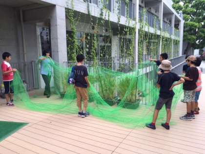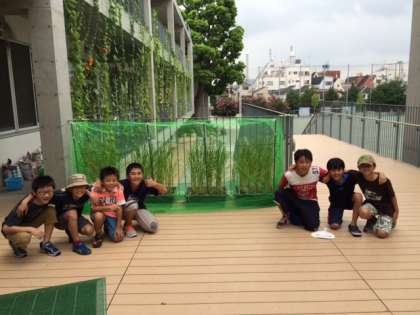 5年生の社会科の学習で米作りをしています。稲には緑色の穂がつき、あと1か月ほどで収穫ができそうです。鳥よけのネットをプール帰りの5年生数人が手伝ってくれました。これで稲も鳥に食べられず、秋に向け育っていくことと思います。
