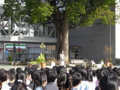 気温も暖かく、澄みきった青空の下、全校朝会が行われました。